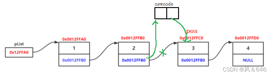 若pos是第一个结点,我们直接调用之前写的头插。若pos不是第一个结点,我们找到pos位置的前一个结点,让新的结点指向地址为pos的结点,然后让前一个结点指向新结点。