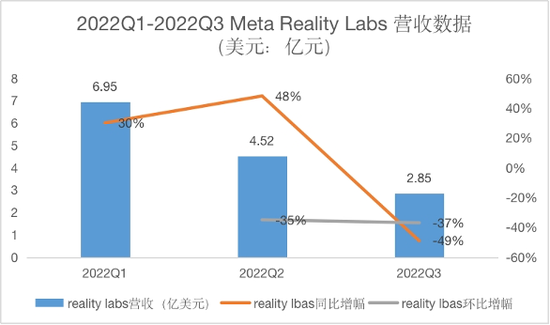 相较之下,同期的研发费用分别为136亿、184亿以及247亿美元,均有19%-21%的稳步同比上升。在年度财报中,Meta也解释了上升主要原因包括对Quest产品的开发。 而从2022年前三个季度的数据上,更能看出Quest营收的乏力。