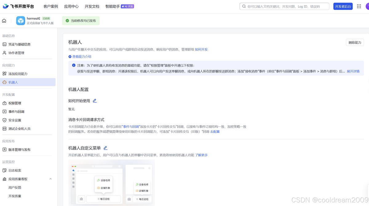 4.5 发布应用左侧:版本管理与发布 → 创建版本 填写版本信息(随便填)→ 保存 点击 发布 企业内应用:无需审核,立即生效 5 Hermes 接入飞书5.1 使用向导配置