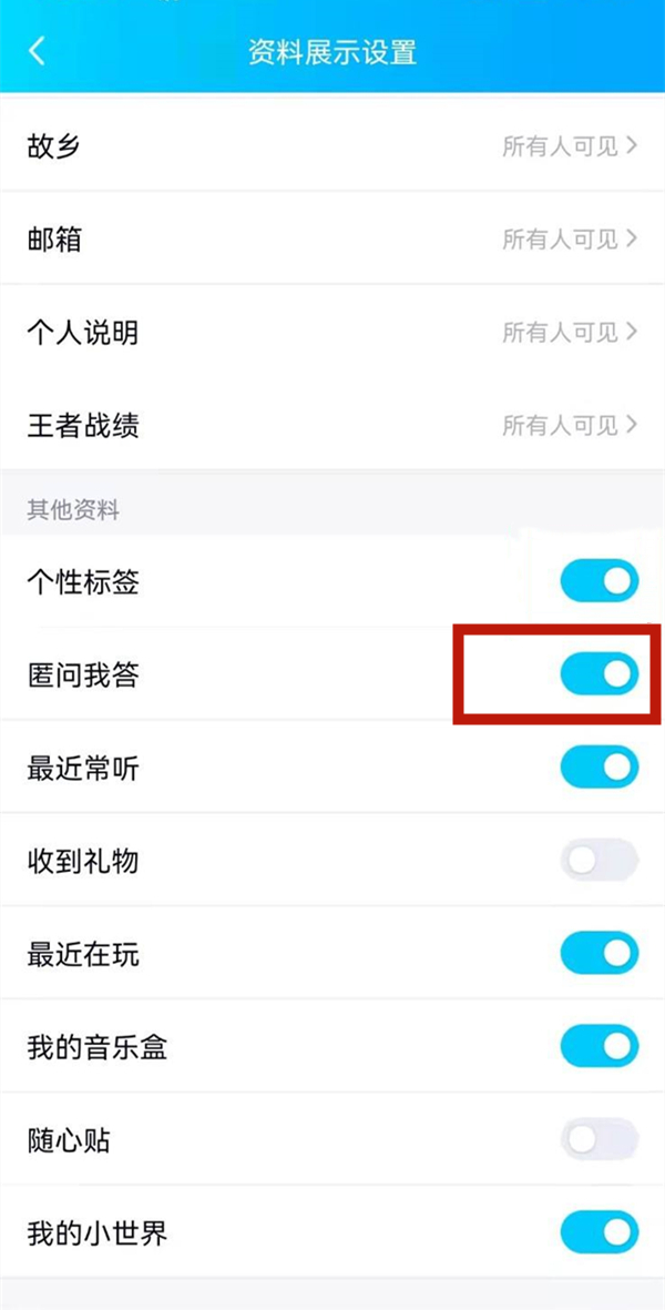 4、关闭[匿问我回答]右边的按钮,在数据显示设置页面上。