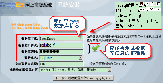 注意:如果数据库信息不正确,此界面中不会出现这个表示正确的对号,请与空间商确认。