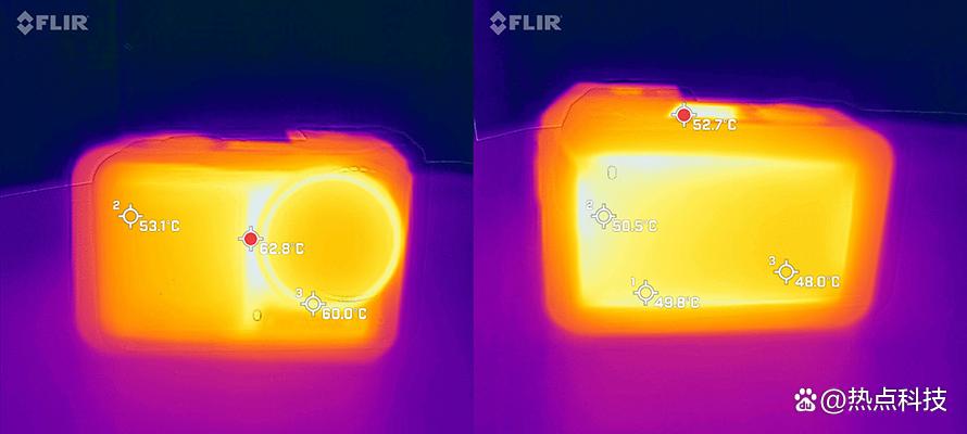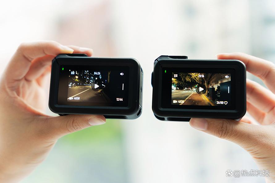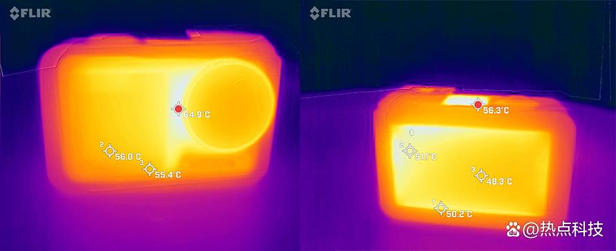 是否存在过热影响?使用竞品GoPro运动相机的用户,应该多少都收到过机身过热自动关机或死机的困扰,可见使用运动相机长时间录制高规格的视频时,我们不能忽视机身过热这个问题,就此我们也对3代和4代做了过热测试,模拟一个30℃的使用环境,同时录制30分钟的4K60P视频,结果显示两台运动相机都启动了过热保护功能,将两面的屏幕都做了息屏休眠处理,而机身温度也大体相当,两台相机最热的区域都是镜头的左侧,3代是62.8℃,4代是64.9℃,并且两款相机的前屏温度都超过了53℃,背面的大屏温度均在50℃左右,机身顶部的温度也相当高,因此想要长时间录高规格视频的话,尽量还是使用延长杆搭配DJI Mino APP应用操控为上,不然真的容易烫手。就散热表现来看,4代和3代表现差不多也实属不易了,单就没有死机没有自动关机这点已经比友商强出太多了。
