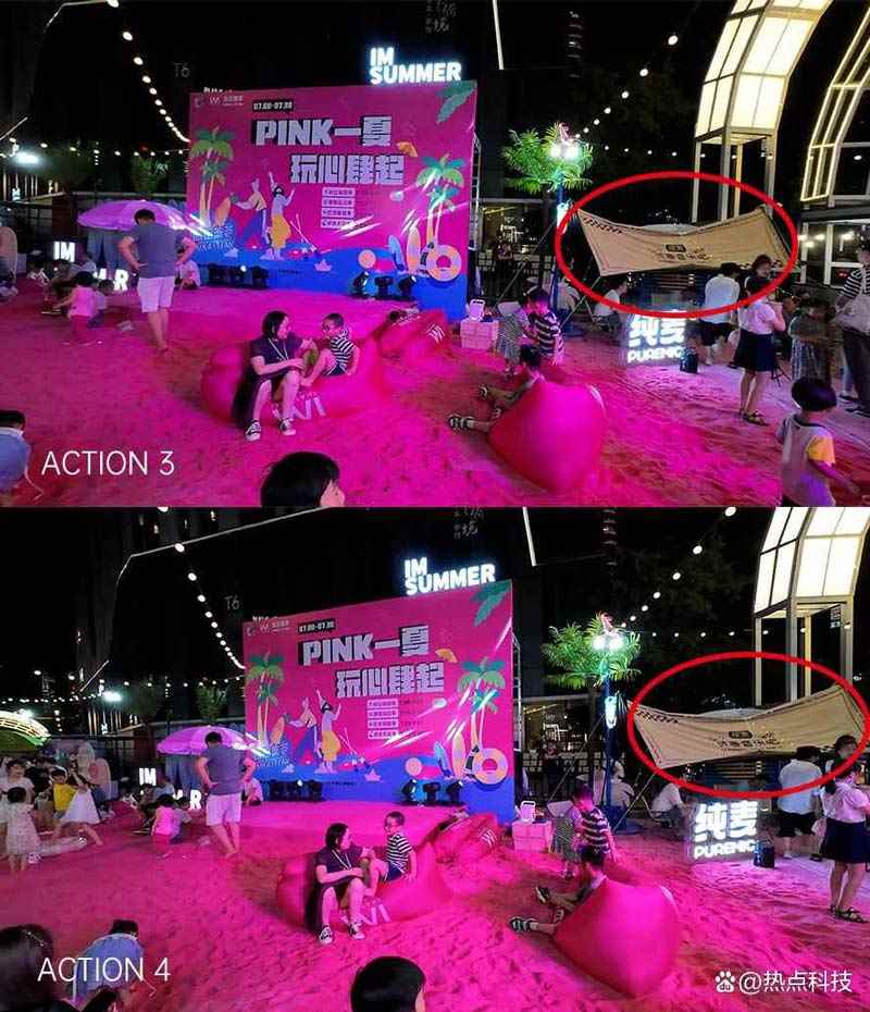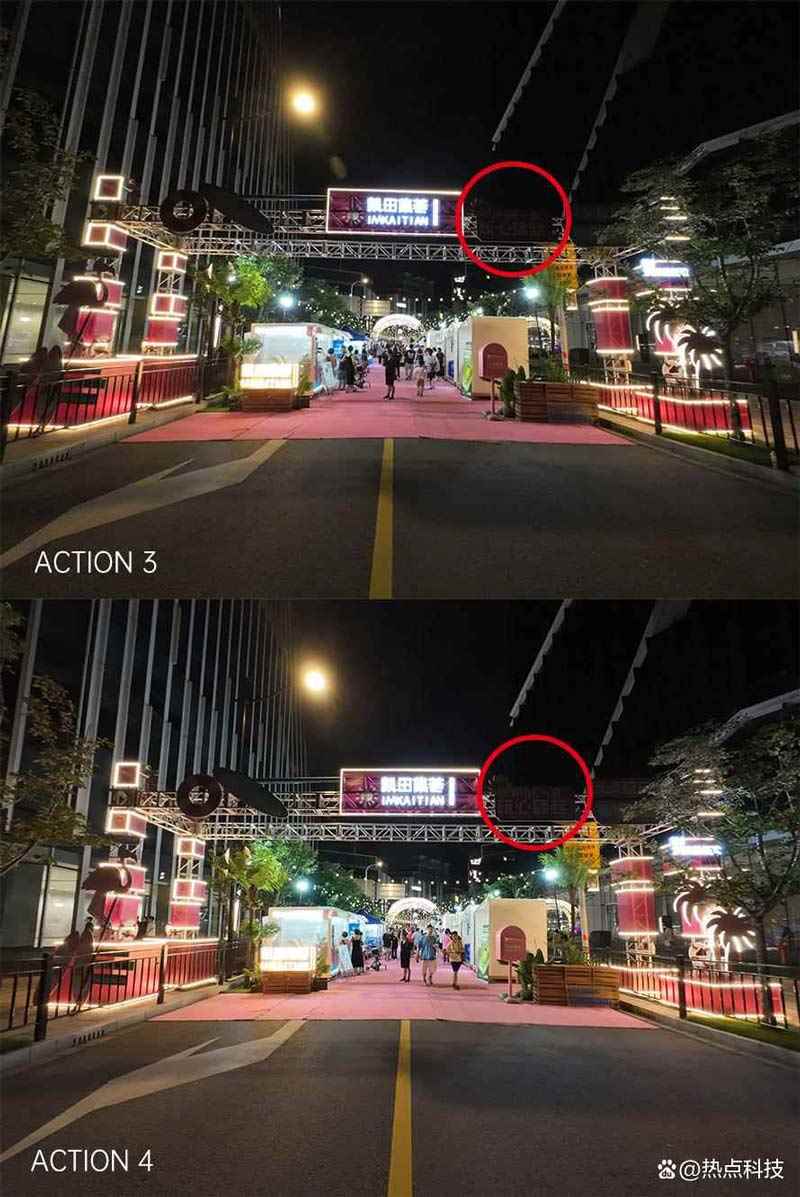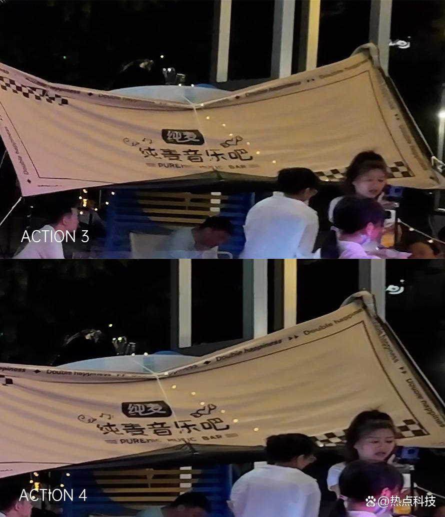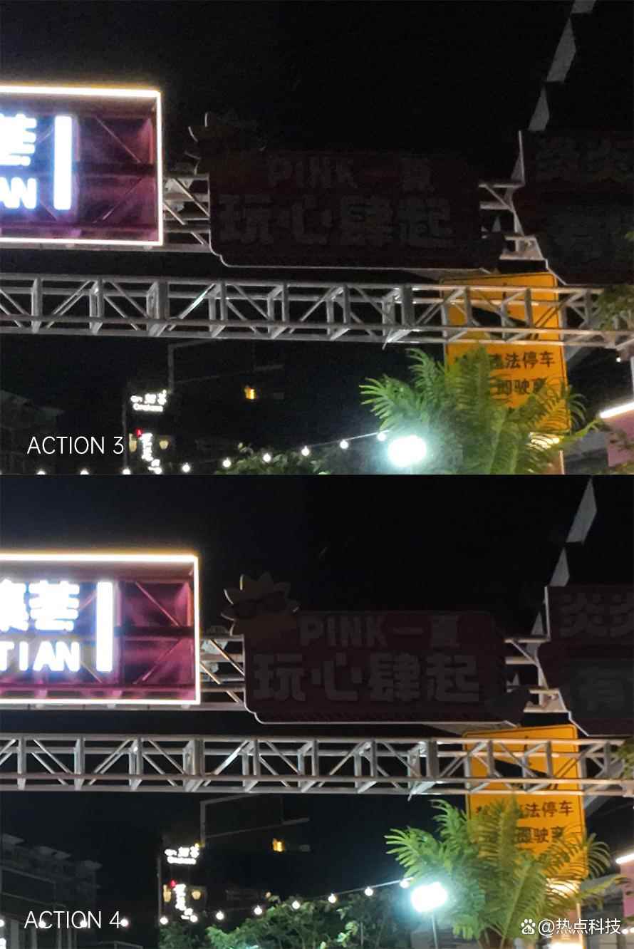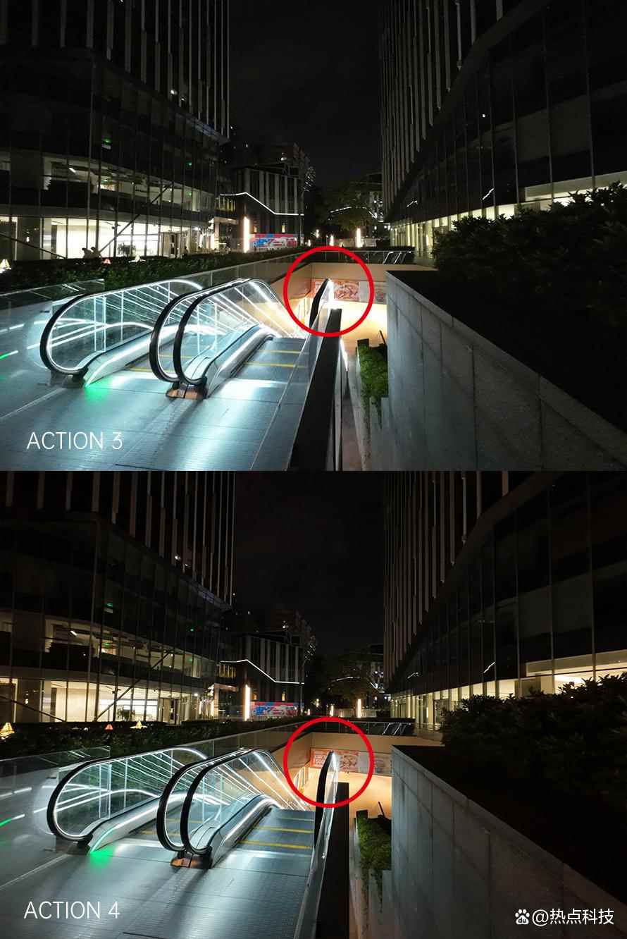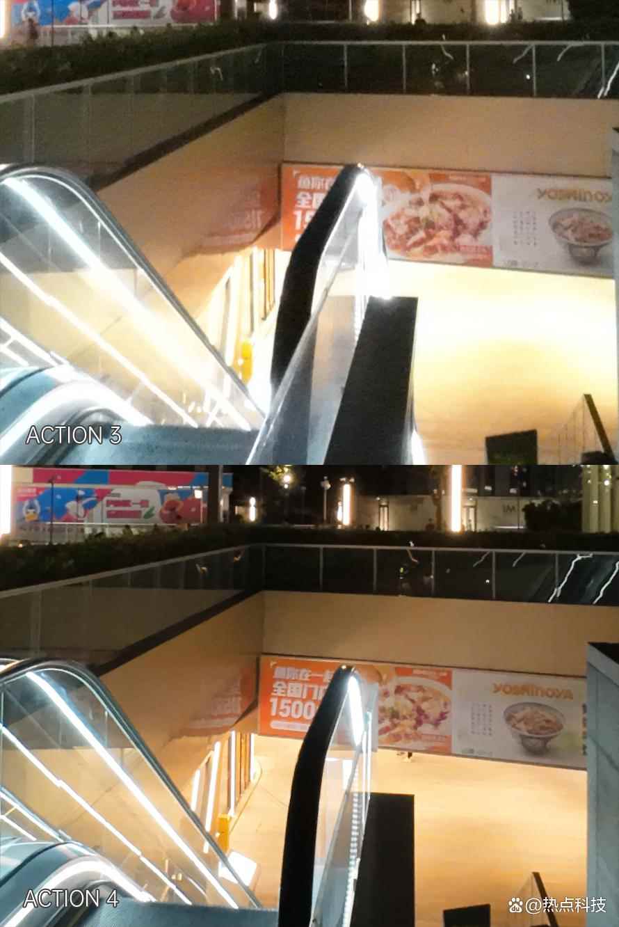 原图灯牌右侧区域100%放大对比 而在第二组对比样张中还能看到,大疆Osmo Action 4对于局部区域高光的控制也要比Osmo Action 3好,这组对比样张的Osmo Action 3在左侧大楼内以及扶梯下方都有明显的过曝区域,而在Osmo Action 4上就控制的相当到位,基本看不出有明显的高光溢出。但两者的夜景照片相比当下的影像旗舰手机夜景表现还是有一些差距,尤其是上一组样张对比的灯箱字体都没有很好的还原,不过鉴于手机的影像算法离不开高性能的处理器,要在大疆的运动相机中装上骁龙旗舰SoC确实是强人所难了。