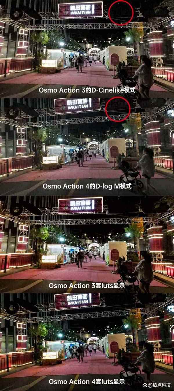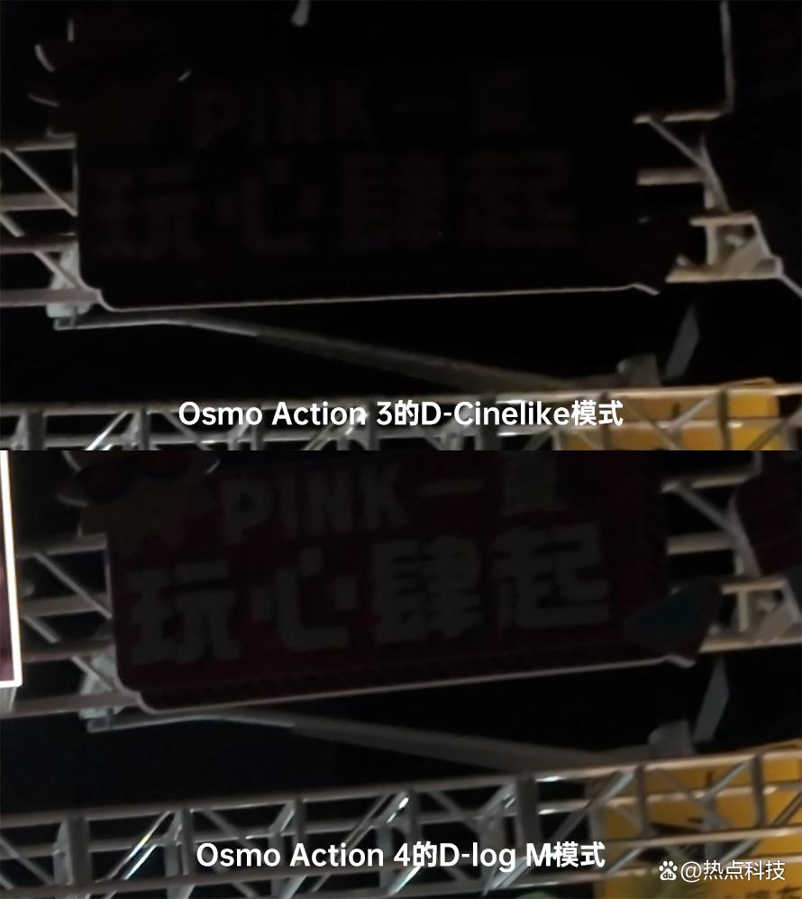 灯牌右侧100%放大对比 在上面这组对比截图中可以直观的看到,虽然D-Cinelike与D-log M在各自套用相应的Luts后都能将拍摄内容恢复成正常的颜色,不过在阴影细节的获取上,D-log M显然要比D-Cinelike更胜一筹,只要后期处理得当,的确可以让画质得到进一步的提升。 不过在去掉D-Cinelike的同时,Osmo Action 4还移除了3代机身上的HDR视频功能,这个HDR视频功能最高支持4K30P格式,并且大疆官方建议是在光线充足的环境中使用这个功能,对此我也对比了一下,大家可以看一下Osmo Action 4直出与Osmo Action 3 HDR格式下的4K30P视频对比,对比结果显示Osmo Action 3的HDR模式画面的对比度相对较低一些,不像4代直出的明暗对比那么明显,但Osmo Action 4使用D-log M模式然后套Luts的话也能实现类似HDR的画面效果,或许也是这个原因,大疆在4代运动相机上移除了这个功能,但也不能排除大疆后续在4代上通过OTA的方式加入该功能的可能性。
