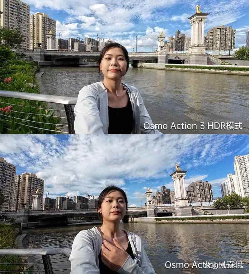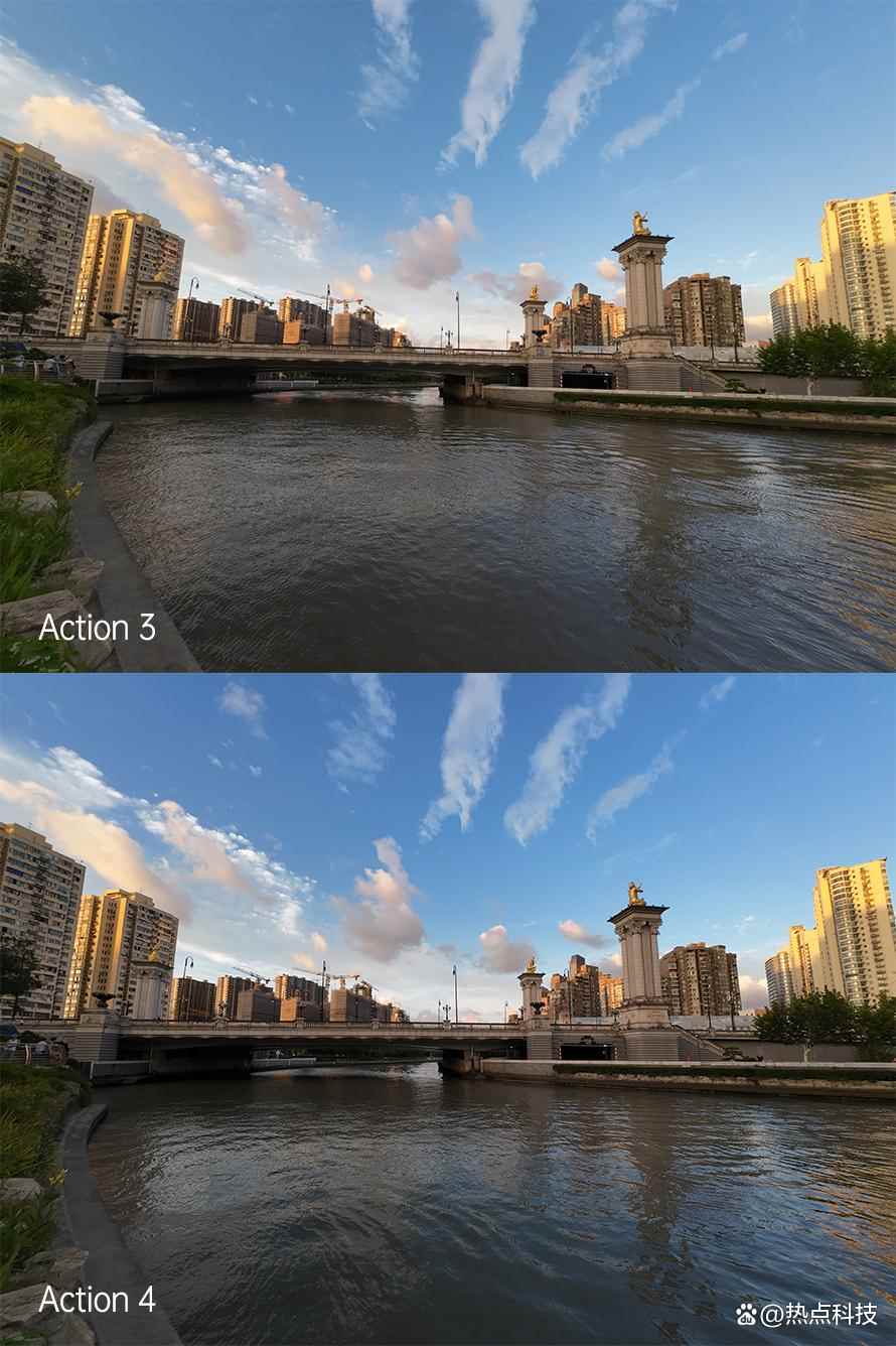照片画质对比接下来我们重点就讲4代的主要变化,首先是画质,先来看一组黄昏时候的样张拍摄对比,很显然Osmo Action 3的色彩表现相对Osmo Action 4来说寡淡一些,4代画面的天空蓝色更加突出,画面的对比度也是4代要更高,房屋和桥梁的轮廓更加明显。