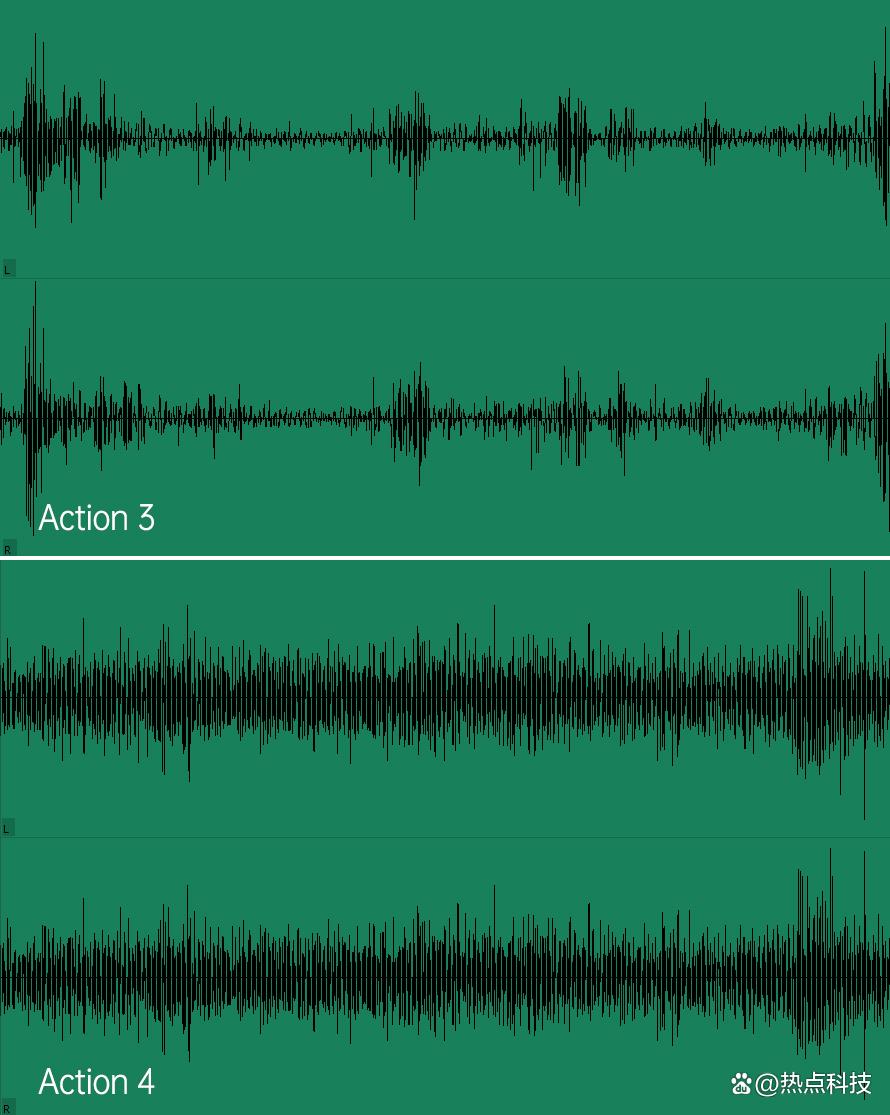 另外,4代在抗风噪的拾音表现上,升级体验也是相当明显的,同样的路段骑行时,3代会有明显刺耳的风噪声,而4代虽然也能听到风噪声,但表现低沉且不刺耳,从波形图的对比中也能直观看到3代的忽高忽低的声波起伏就是风噪在捣鬼,而4代的声波起伏就没那么大,风噪的影响自然就小了不少,所以如果要用运动相机拍摄骑行vlog讲解内容的话,显然4代更能胜任这个任务。