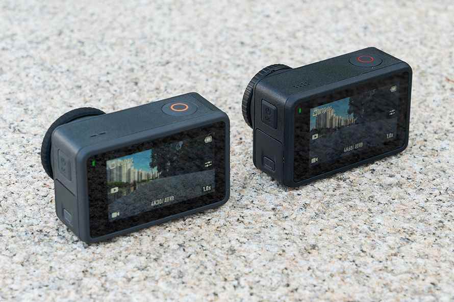 是大底,但外型变化不大将Osmo Action 3和Osmo Action 4放在一起对比可以看到,两者在外观设计上的差异主要就三点,首先就是Osmo Action 4用上了更大的底,所以镜头看起来确实要比3代大了不少,而且镜头上还标注了CMOS和镜头的规格,1/1.3英寸大底,光圈值f/2.8,视场角155°,当然光圈和视野与3代规格一样,焦段方面也和3代全面保持一致,没有更广也没有更窄。另外两个差异点就是机身和顶部录制键的颜色,4代机身由3代的蓝灰风格变成了黑色,产品logo右侧以及录制键的颜色则由橙色改为红色,至于其它按键和双屏规格则没有任何变化。