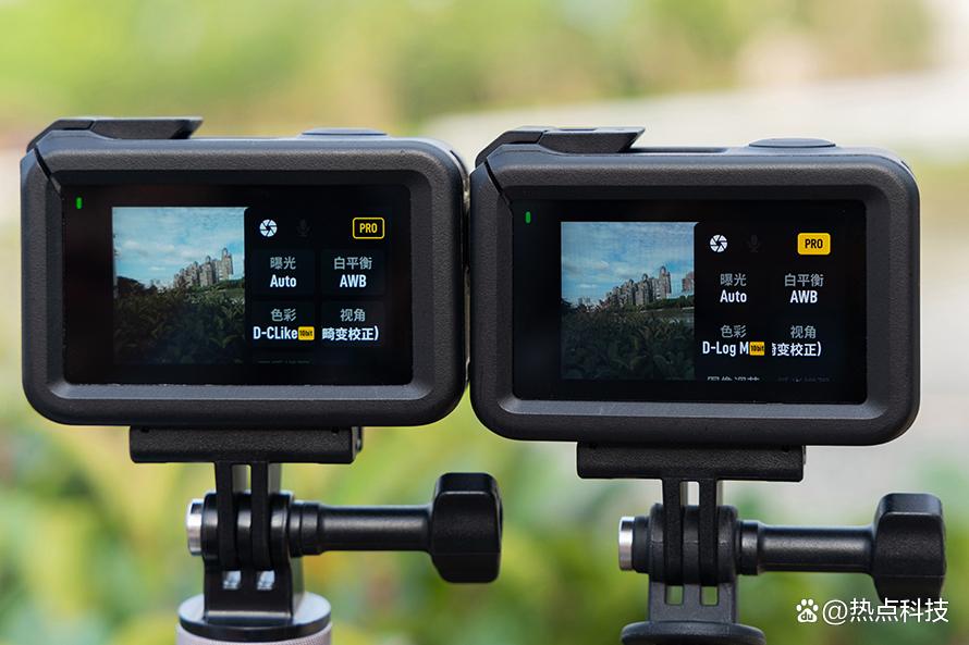 原图右侧100%放大对比 第二个显著变化是Osmo Action 4加入了D-log M色彩模式,但同时去掉了D-Cinelike,D-log M在大疆Mavic 3 Pro无人机上首次出现,它的作用类似于D-log,主要是为视频后期处理上提供了更多的空间,套上Luts后可以更好的还原视频内容的内容细节,不过宽容度要比D-log要逊色一些,但其后期空间还是要比log基础上套入模拟电影风格的D-Cinelike更广,不过这也更需要用户在影像后期方面拥有一定的能力,所以产品定位上Osmo Action 4的客户画像应该是专业的摄影师。下面是D-log M模式的Osmo Action 4和D-Cinelike模式的Osmo Action 3在4K50P格式下的拍摄对比。