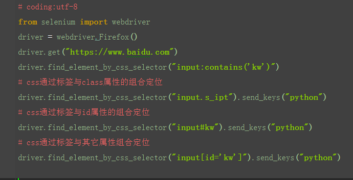 ①css元素定位使用#号表示id属性,如:#kw ②css元素定位方式使用.表示class属性,如.s_ipt ③css元素定位方式也可以直接使用标签名称,而没有任何标识符,如:input