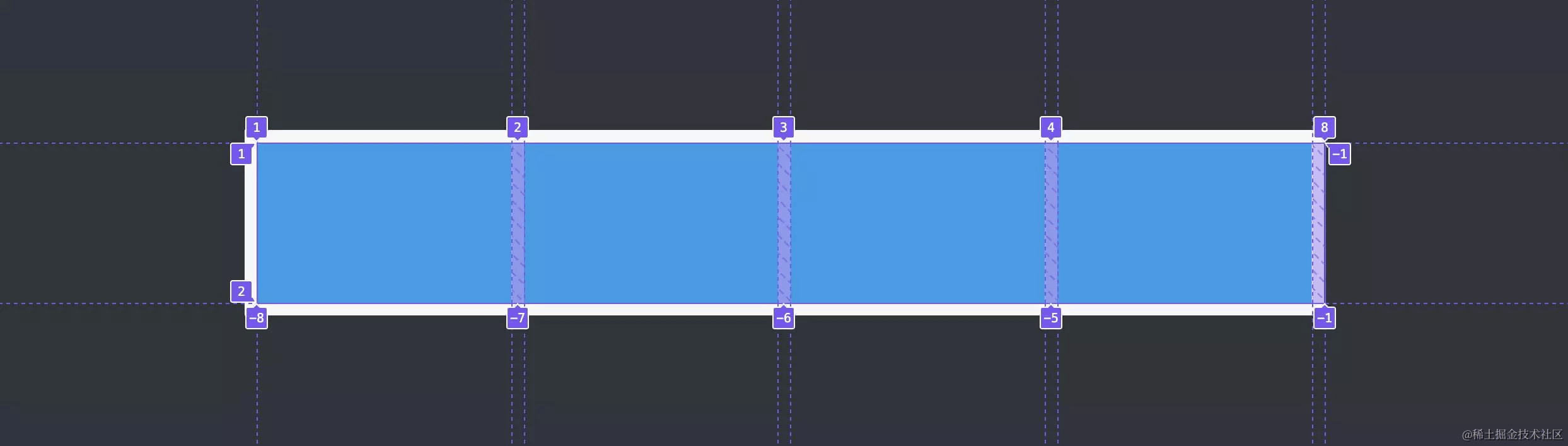 上面的代码提供了两列。最左边的垂直网格线(数字 1)称为"sidebar",中间的网格线(数字 2)称为"content-start",最后的网格线(数字 3)称为 "content-end"。 我们还可以在 repeat() 函数中使用命名线: