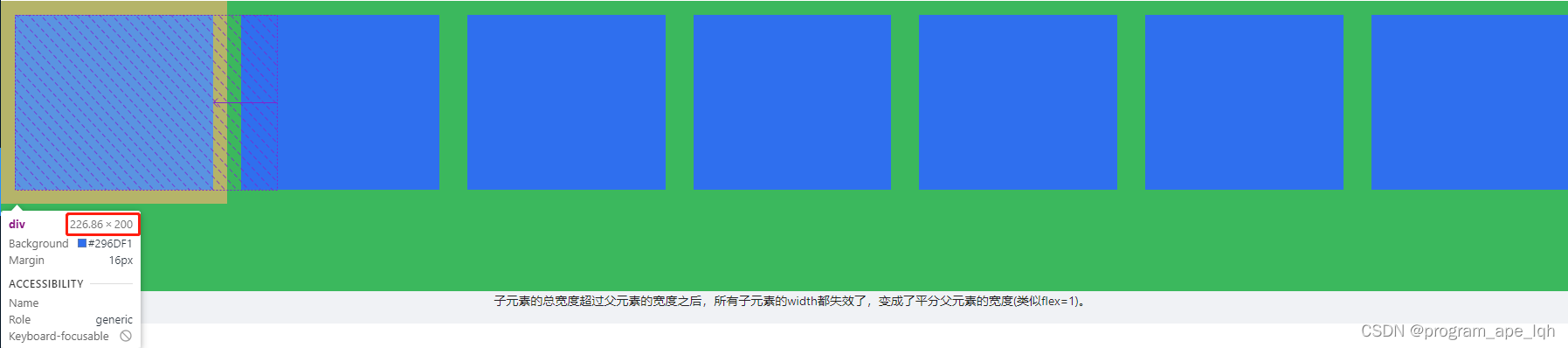 父级div设置了display:flex,子元素的总宽度超过父元素的宽度之后,所有子元素的width都失效了,变成了平分父元素的宽度(类似flex=1)。