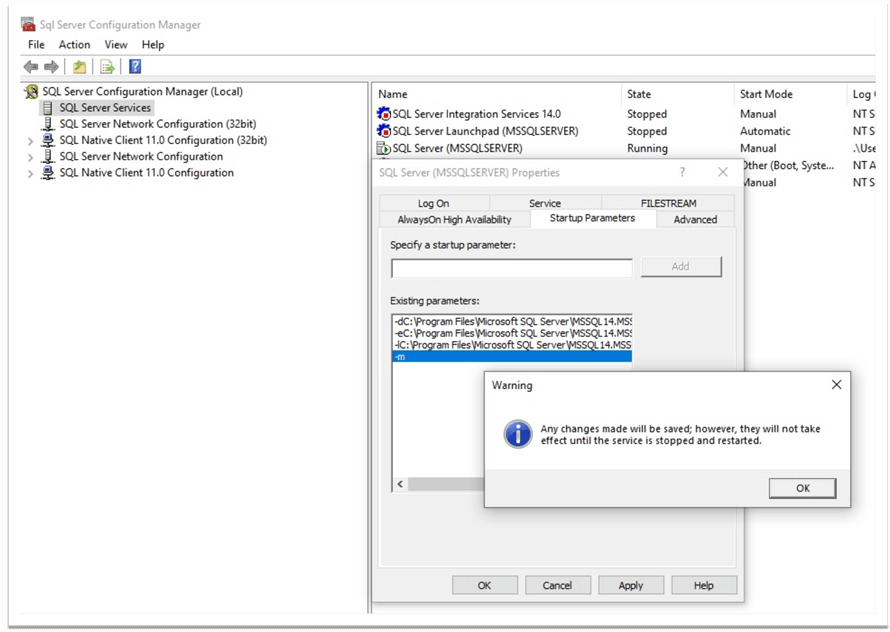 要在单用户模式下启动 SQL Server,我们使用“SQL Server 配置管理器”添加相应的启动参数-m 。 为此,请打开“SQL Server 配置管理器”,选择“SQL Server 服务”,然后选择相应的 SQL Server 实例,右键单击它并选择“启动参数”。作为启动参数,我们指定“-m”,表示服务将以单用户模式启动。