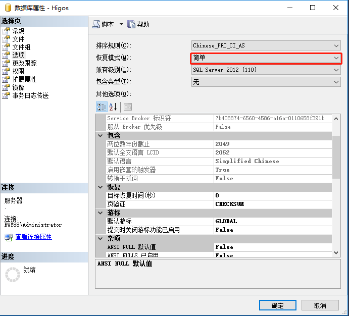 解决方案2 -收缩数据库日志文件(最靠谱方案!)分两步操作:step 1.操作步骤:在数据库右键 --> 数据库属性 -->选项 -->将数据库【恢复模式】修改为【简单】。点确定按钮。