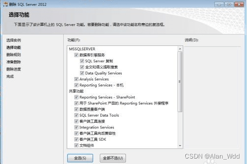 6、 这时进入“选择功能”,为了完全删除全部安装文件,选择“全选”,点击“下一步”