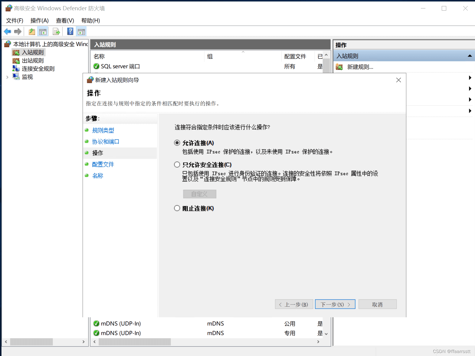 重启服务器后,依然无法连接,我以为是SQL Server Express版本不支持远程连接,换成开发版后依然无法连接。按照这篇教程SQLSERVER 不能远程连接的完美解决方案 又用telnet排查 ,发现telnet无法连接,所以开始检查防火墙设置。按照下面的教程进行设置后问题解决。 如何配置Windows 防火墙,允许SQL Server的远程连接 首先打开防火墙设置,点击高级设置