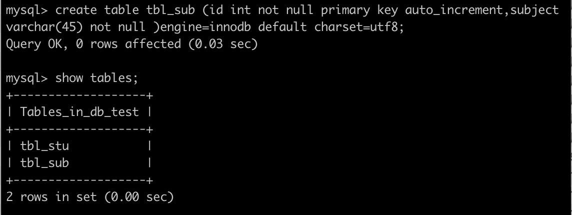 1.创建学生表 1 2 3 4 5 6 7 create table tbl_stu ( id int not null primary key auto_increment, name varchar(45) not null )engine=innodb default charset=utf8; 2.创建科目表 1 2 3 4 5 6 7 create table tbl_sub ( id int not null primary