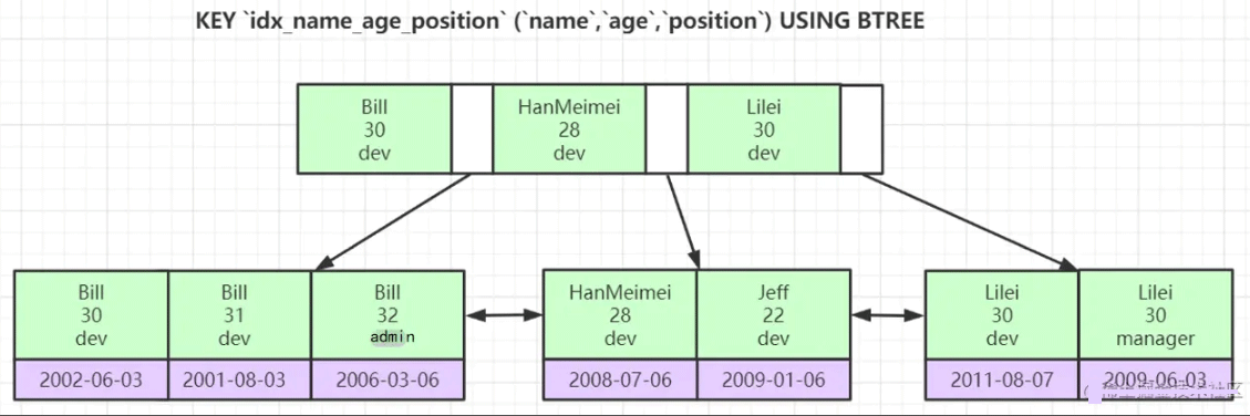 联合索引和单索引差不多,只不过是先按第一个字段排序,再按第二个字段排序,然后再按第三个字段排序。 这种排序规则表明了只有在第一个字段相等的情况下,第二字段才是有序的。第二字段相等的情况下,第三个字段才是有序的。 所以 name = 'Bill' and age = 20 and position = 'dev' 可以用到全部索引, 因为 name 确定了,age 是有序的,age 可以走索引, age 确定后 position 可以走索引。这个联合索引可以全部用到 如果是 name = 'Bill and age > 30 and position = 'dev'' , 首先name 可以走索引,name 确定后 age 是有序的,age 也可以走索引,但是 age > 30 导致 age 查出来的数据有多个(31 32), 31 和 32 下的 position (dev admin ) 不是有序的,便无法利用二分算法进行查找。所以无法利用 position 这个索引,这也就是左前缀法则的原理和联合索引失效的原理 |