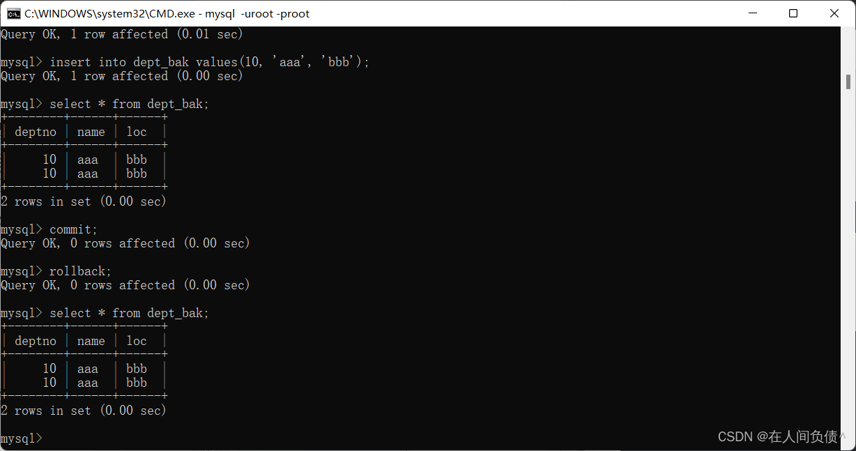 2. 回滚事务回滚只能回滚到上一次的提交点