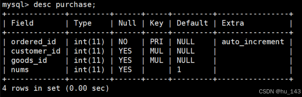 上图中从表中的class_id是具有外键约束的。这时向student表中插入数据时,如果插入的数据对应的class_id是myclass表中存在的,或者插入的class_id为null,那么此时是允许进行插入的。 当插入的class_id不是myclass表中存在的,那么就会插入失败。通俗理解:当试图插入或更新数据时,MySQL会检查引用的主键列是否存在有效值。如果没有有效的主键值,则无法插入或更新数据。 所以在对外表进行插入数据时,所具有外键约束的字段,插入的数据必须在主表中存在。否则就会插入失败。我们还需要注意的是:外键列的值必须是唯一的,不能有重复值。 九、练习有一个商店的数据,记录客户及购物情况,有以下三个表组成: 商品goods(商品编号goods_id,商品名goods_name, 单价unitprice, 商品类别category, 供应商provider);客户customer(客户号customer_id,姓名name,住址address,邮箱email,性别sex,身份证card_id);购买purchase(购买订单号order_id,客户号customer_id,商品号goods_id,购买数量nums)。 要求: 每个表的主外键;客户的姓名不能为空值;邮箱不能重复。