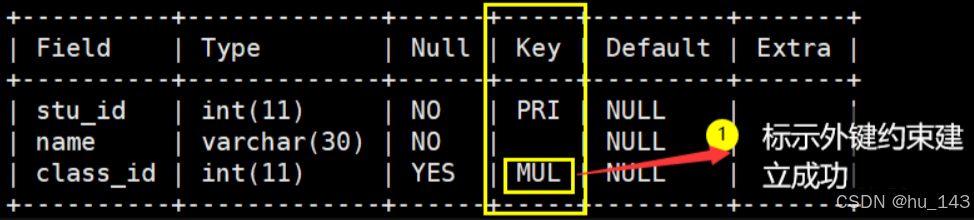 通过上图,我们也能发现某个字段具有唯一性约束时,该字段也可以为NULL。但是主键的值是不能为NULL的。其次,一但插入重复的值,就会报错。同时,一张表中可以设置对个唯一键,但是一张表中只能有一个主键。 唯一键的本质和主键差不多,唯一键允许为空,而且可以多个为空,空字段不做唯一性比较。关于唯一键和主键的区别: 我们可以简单理解成,主键更多的是标识唯一性的。而唯一键更多的是保证在业务上,不要和别的信息出现重复。 需要注意的是,不是主键具有唯一性,而是某个具有唯一性的字段被选择成为了主键,而那些不是主键但是同样需要唯一性约束的字段就应该设置成唯一键。 八、外键外键用于定义主表和从表之间的关系:外键约束主要定义在从表上,主表则必须是有主键约束或unique约束。当定义外键后,要求外键列数据必须在主表的主键列存在或为null。 一个学生一定隶属于一个班级。一个班级会有很多学生。所以当我们在定义学生表时,班级的信息一定会有大量的重复。 如下图: