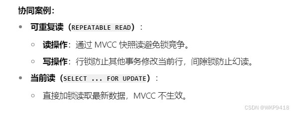 看下,在RR隔离级别下,如何解决不可重复读、幻读呢?可重复读其实读到的是历史数据,这叫快照读。只会读取历史数据,不用加锁。其他事务此时insert或update或delete的话,他们的创建版本号或者删除版本号会改变。此时insert的话,假如创建版本号是10。而另一个RR事务版本号是5。MVCC规定,事务版本号是5的话,select的时候,只能查到 创建版本号<=5的数据。所以不会查到创建版本号是10的数据。其实这也解决了幻读。从这里可以看出,MVCC只能解决快照读场景下面的幻读,不能解决当前读场景下的幻读。举个例子: