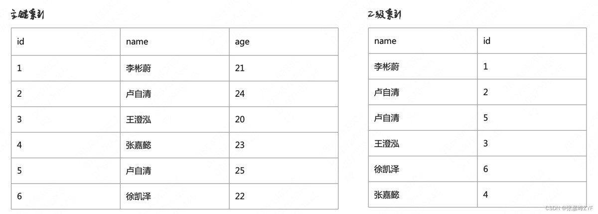 Next-Key Lock 可以保证不会出现幻读的情况,因为 Next-Key Lock 不仅锁定了范围,还锁定了范围内的记录。而幻读是由于范围内有新插入的行导致的,Next-Key Lock 可以锁定这些新插入的行,从而避免了幻读的发生。 (六)死锁问题分析既然InnoDB对记录操作时会加锁,不可避免会出现死锁的问题。如果两个事务在执行过程中,都持有对方需要的锁,并且在等待对方释放锁,此时就发生了死锁。 简单锁举例场景假设我们有一张表user(id, name, age),id是主键,name是普通索引。索引数据如下