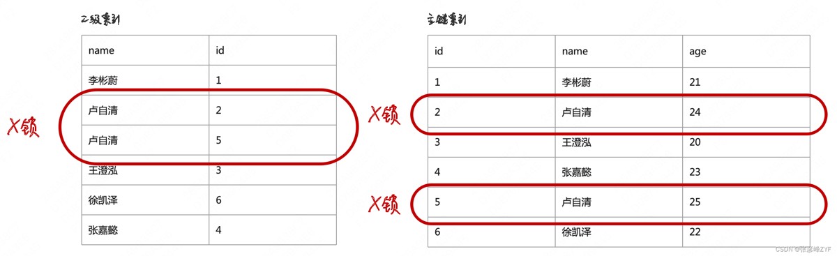场景二:delete from user where name='卢自清' 走name二级索引,会先锁住二级索引,然后再去锁聚簇索引上对应主键的记录