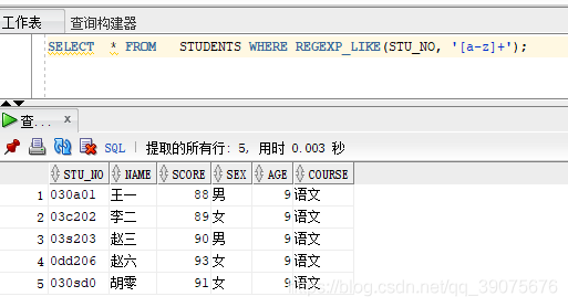 分享之前先给大家讲讲这些参数 1、source_char,输入的字符串,可以是列名或者字符串常量、变量。 2、pattern,正则表达式。 3、match_parameter,匹配选项。 match_parameter的取值模式: i:大小写不敏感; c:大小写敏感; n:点号 . 不匹配换行符号; m:多行模式; x:扩展模式,忽略正则表达式中的空白字符。 4、position,标识从第几个字符开始正则表达式匹配。 5、occurrence:标识第几个匹配组。 6、return_option: 0:pattern的起始位置 ,1:pattern下一个字符起始位置, 默认为0 7、replace_string,替换的字符串。 下面我给大家介绍第一种 1.REGEXP_LIKE标量函数 REGEXP_LIKE标量函数返回一个布尔值,该布尔值指示是否在字符串中找到了正则表达式模式。这个函数和LIKE函数几乎很相近,只是LIKE函数匹配的是具体的字符或者数字,而这个函数匹配的是正则表达式。 例如一张学生表中的学号既有全数字的也有数字字符混在的,现在学校希望将有字符混在的学号跳出来,这事就这可以用这个函数 表数据如下: