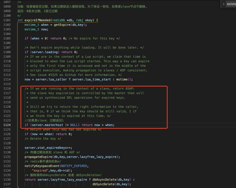 2、源码分析在分析该问题前,需要了解Redis在读写分离模式下读到过期数据的问题: Redis过期key的删除策略采用惰性删除和定时删除: 惰性删除:主节点每次处理读取命令时,都会检查键是否超时,如果超时则执行del命令删除键对象,之后del命令也会异步发送给从节点。需要注意的是为了保证复制的一致性,从节点自身永远不会主动删除超时数据; 定时删除:Redis主节点在内部定时任务会循环采样一定数量的键,当发现采样的键过期时执行del命令,之后再同步给从节点; 如果此时数据大量过期,主节点采样速度跟不上过期速度且主节点没有读取过期键的操作,那么从节点将无法收到del命令。这时在从节点上可以读取到已经超时的数据。Redis在3.2版本解决了这个问题,在从节点上读取数据之前也会检查键的过期时间来决定是否返回数据。但是,4.0.10版本以下的exists命令实现方式有问题,导致该命令还是查询到过期数据问题。 下面是4.0.10以下版本exists命令实现源码: