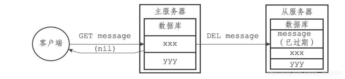 假设在此之后,有客户端向主服务器发送命令GET message,那么主服务器将发现键message已经过期:主服务器会删除message键,向客户端返回空回复,并向从服务器发送DEL message命令