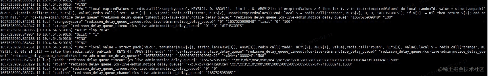 因为redisson 延时队列是基于redis实现的,所以从redis执行命令开始入手排查 1.打开redis监控,启动服务,发现redis首先执行了blpop命令,阻塞等待{cl-live-admin:notice_delay_queue} 队列消息