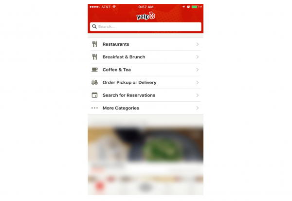 5. 全屏导航 前面的4种设计方案的基本思路,都是尽可能的少占据屏幕空间,而全屏式导航则采用了完全相反的策略。这种设计方法,直接将主页做成导航,用户打开首页之后,可以上下滚动浏览导航类目,根据需求来点击不同的导航,寻找自己想要的内容。 这种设计模式通常适用于目标任务比较明确的网站,尤其适合于那种用户任务会固定在特定的类别当中的应用和网站。这种结构明确的网站,对于他们的固定用户而言,是非常的清晰、明确的,一方面可以让网站的设计和优化更加便捷,另一方面对用户而言更加好用,更容易集中注意力。Yelp网站就使用全屏导航让设计以更加一致的方式来组织导航内容,更有针对性的展示信息。