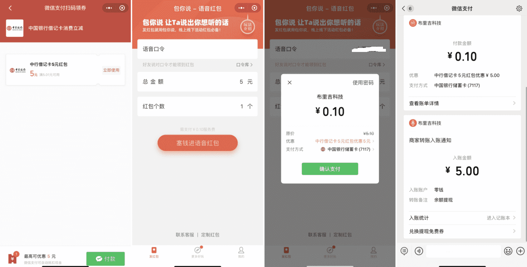 PS:第一个全国地区都能领,第二个只能广东地区的领了使用! 1、微信小程序搜索“包你说”->发1个5元的红包->选中国银行支付就会抵扣->支付0.1元 2、然后发给自己小号->自己点开小程序->读语音->就会获得红包->然后手动提现->秒到账 |