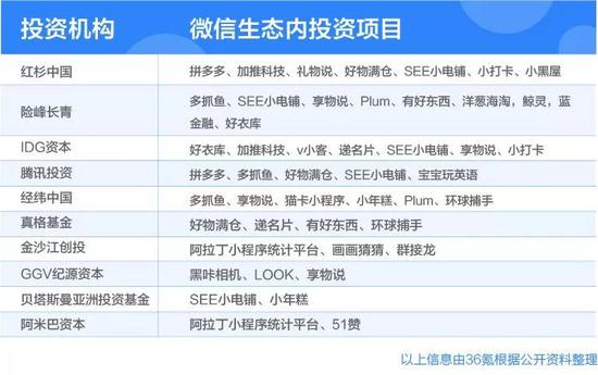 从成立之初就关注交易端的机会的险峰长青,则是最早系统性看微信生态的机构之一,在早期投进了SEE小电铺、多抓鱼、Plum、享物说、有好东西等项目。还有一些投资机构布局了微信生态内“做基础设施”的项目,比如阿米巴资本。合伙人赵鸿告诉36氪,阿米巴从关注企业服务SaaS的逻辑出发,投资了51赞、阿拉丁小程序等项目,收割了“金矿旁边卖牛仔裤”的人。