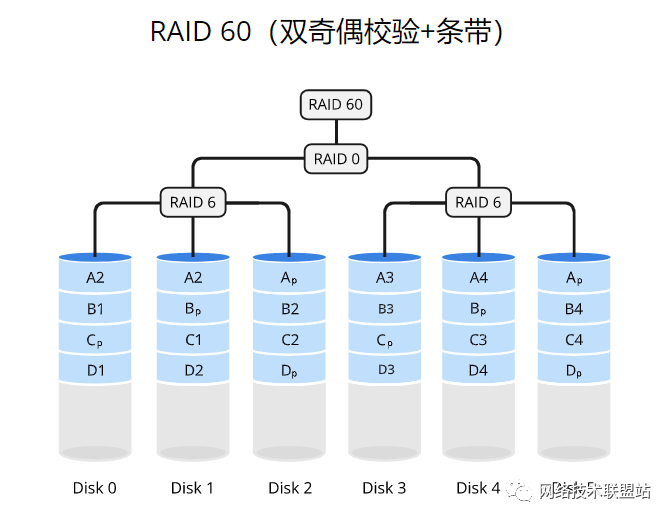 原理图以下是RAID 60的冗余原理图,展示了数据条带化和分布式奇偶校验的方式: