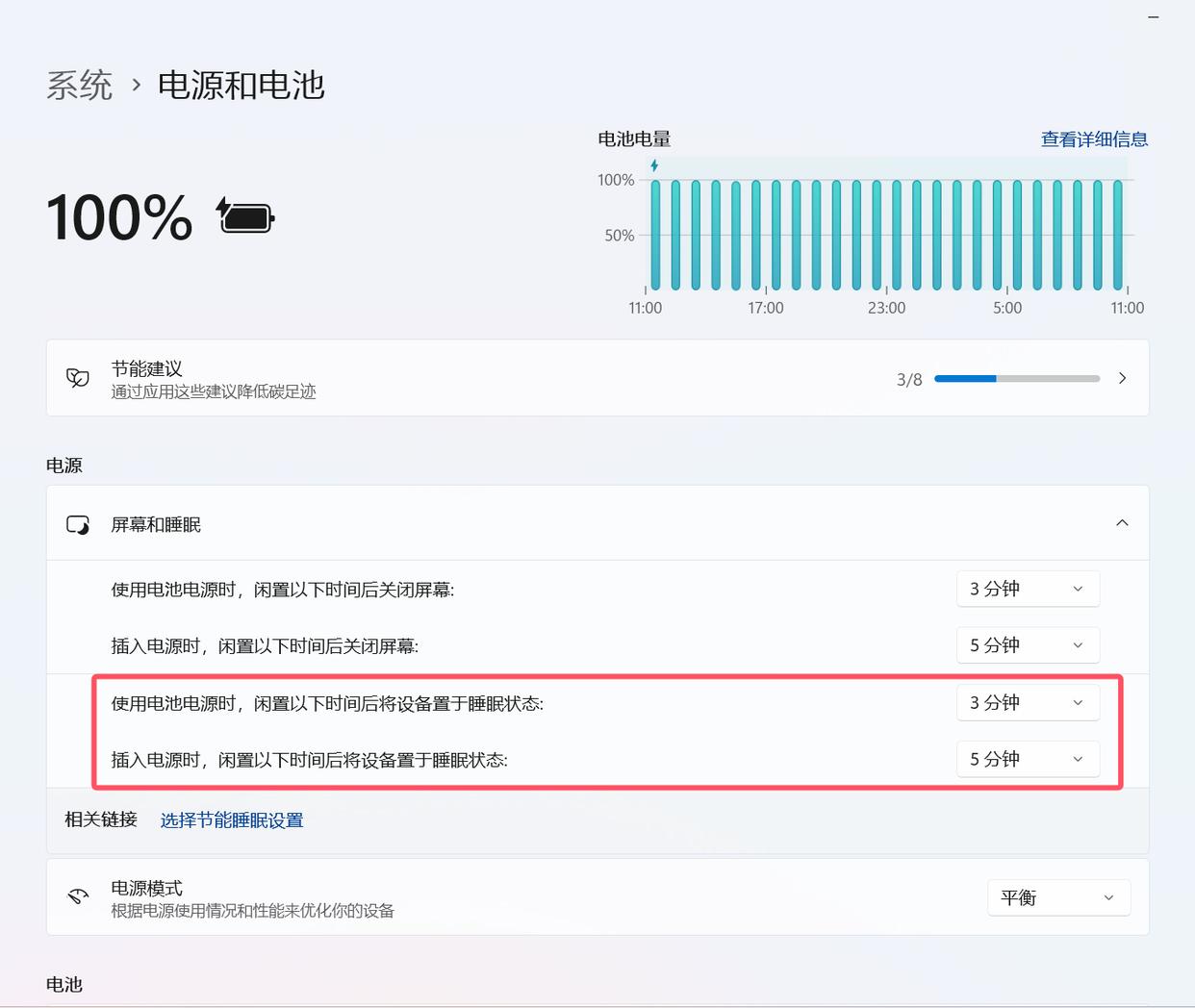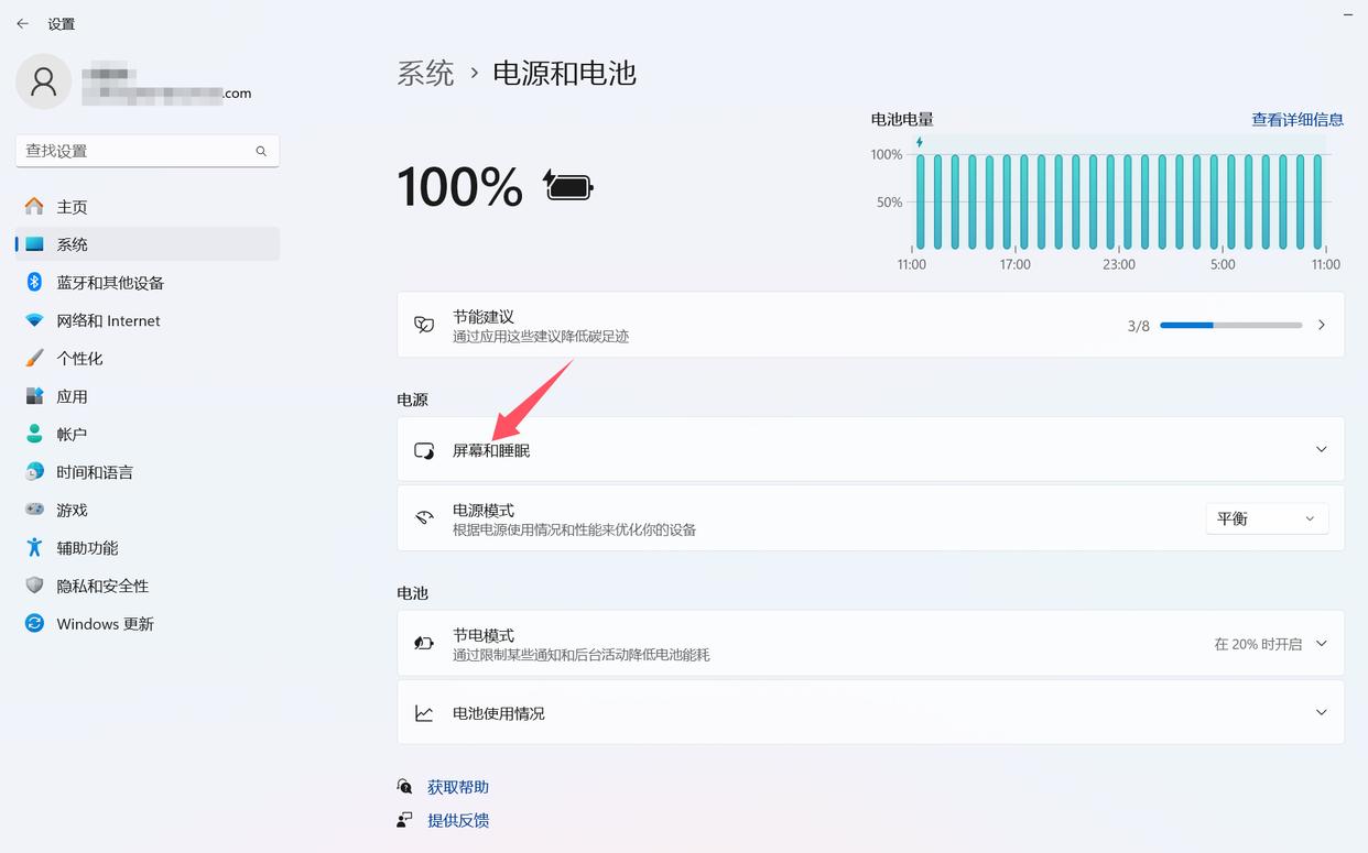 在【屏幕和睡眠】栏,根据需要设置使用不同电源时,闲置多长时间后关闭屏幕。