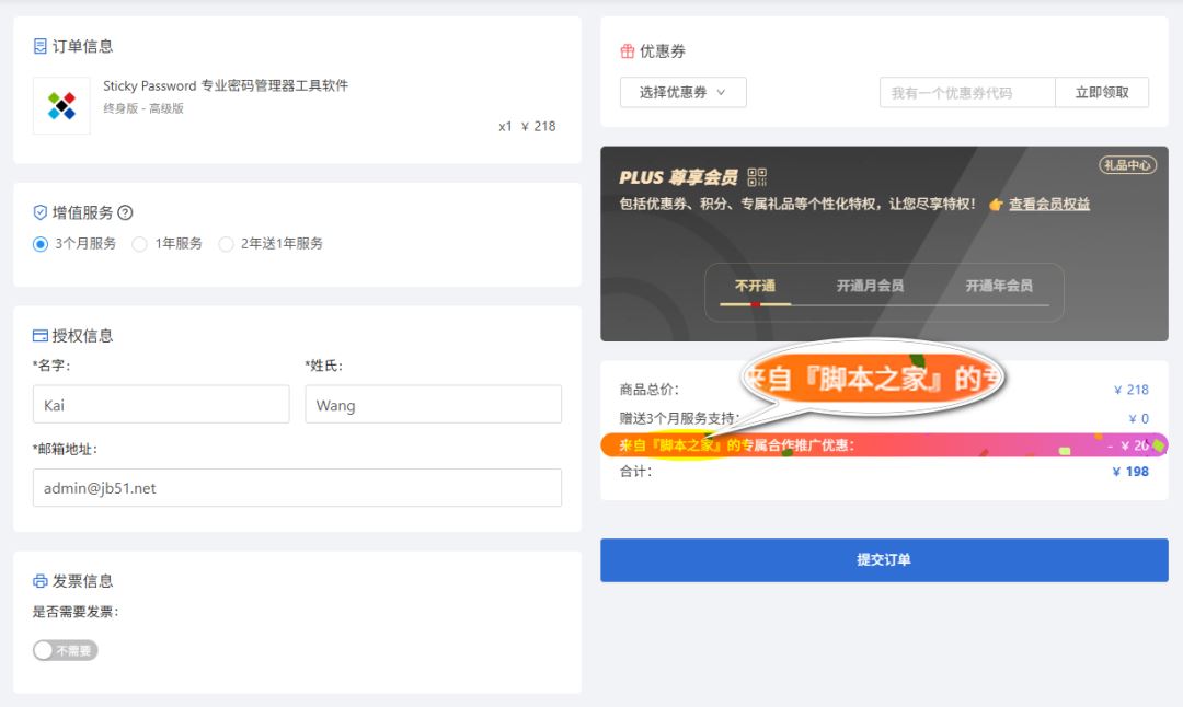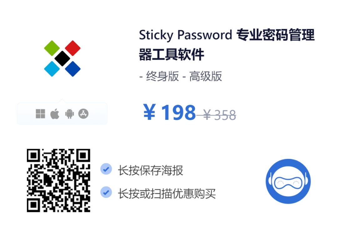 个人版每个月 2.99 美元,1年就是 12*2.99=35.88 美元。今日汇率换算,35.88 美元约等于 255.6988 人民币 (二)Sticky Password Sticky Password 提供了终身版计划,通常官网价格为 79.99 美元,按照汇率计算,大概需要 570 元人民币。但目前通过「脚本之家」专属优惠链接购买,价格仅为 198 元人民币!只需支付一次费用,您就能永久享受其高级保护功能,不仅价格更低,还能让您一次性解决密码管理问题,无需每年续费。