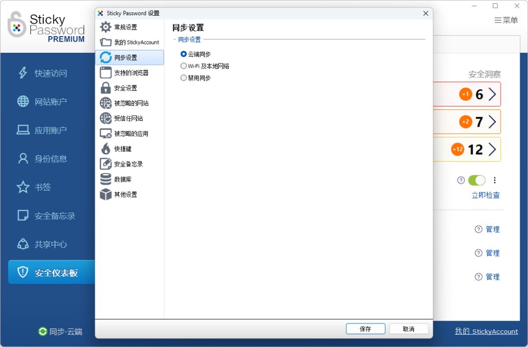 (五)数据同步 Sticky Password 提供了多种数据同步选项,包括云同步和备份、本地 WiFi、手动离线以及不进行同步等,让你可以根据自己的需求选择最合适的同步方式。这种灵活性确保了用户在不同设备上都能无缝访问他们的密码。