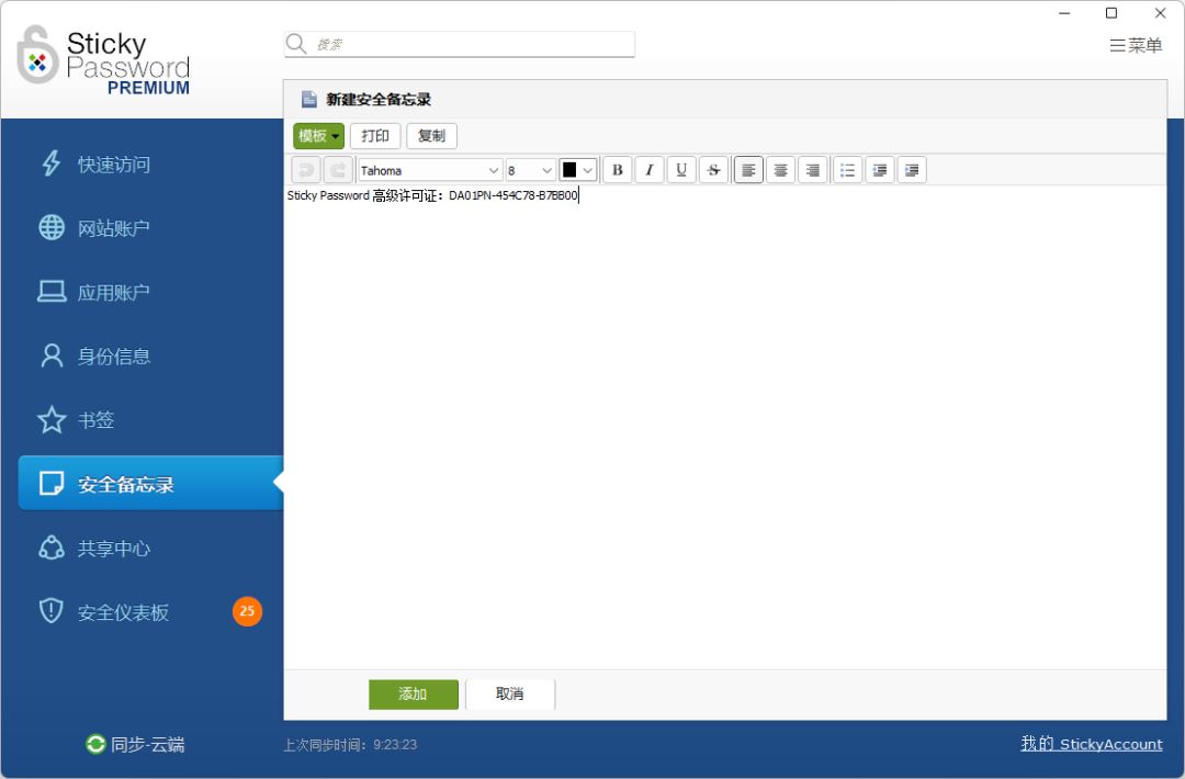 (九)保护私人笔记和其他文本数据 你可以将秘密、许可证、护照信息等其他文本数据存储在 Sticky Password 的保险库中,确保它们的安全。这一功能为用户提供了额外的隐私保护,确保所有重要信息都得到妥善管理。