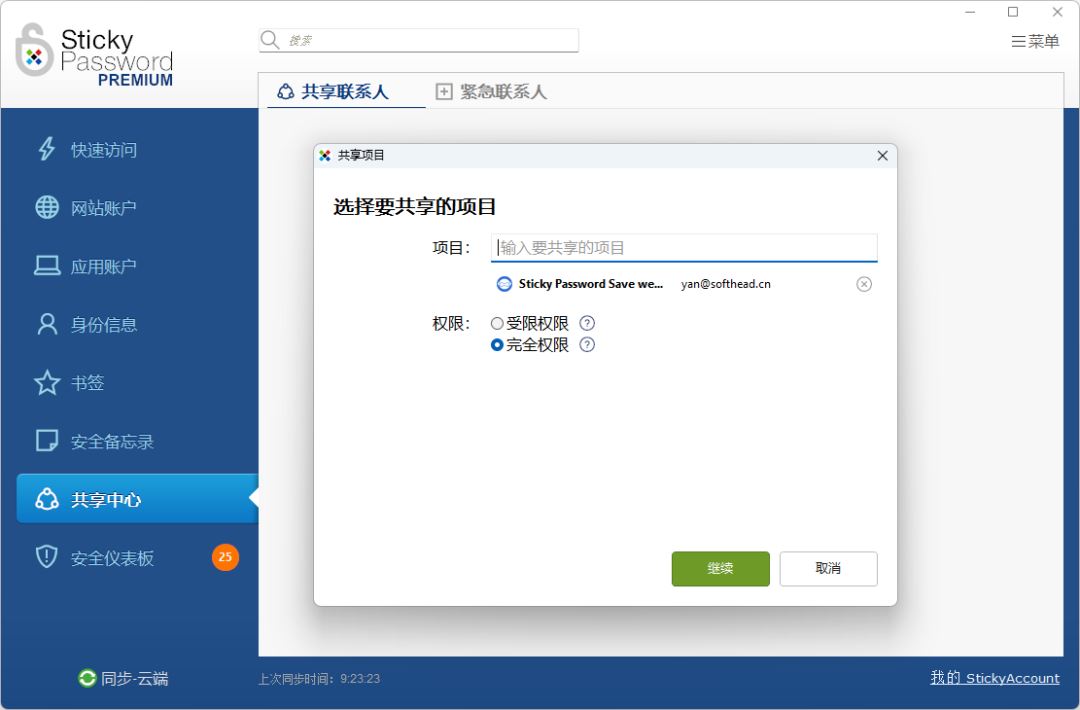 (六)安全共享 您可以通过 Sticky Password 安全地共享你的密码和登录信息,授予、管理和撤销他人对你的在线账户的访问权限,并设置相应的权限。这一功能非常适合家庭用户和团队使用,确保共享信息的安全性。