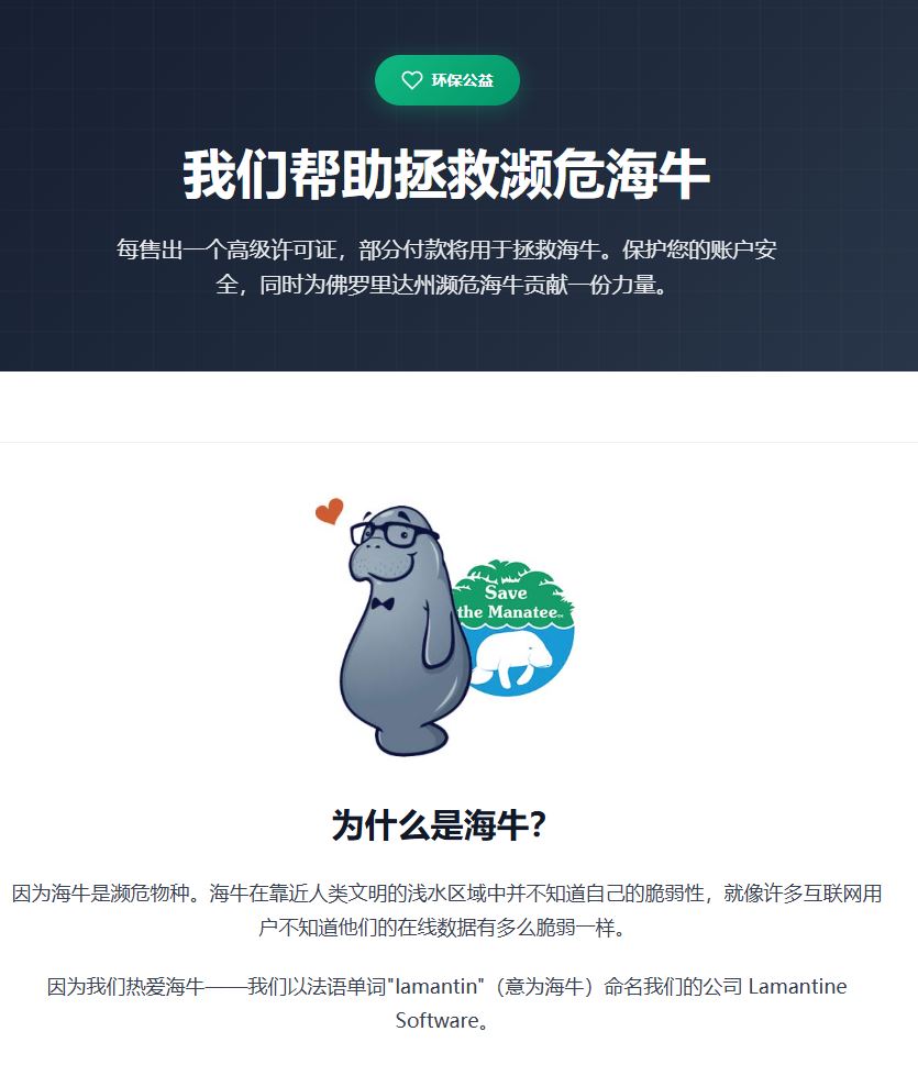(十)助力保护濒危海牛 每售出一个 Sticky Password 的高级许可证,都会有一部分款项用于拯救濒危的海牛。通过使用 Sticky Password,你不仅能够提升自己的数字安全,还能为保护环境做出贡献。