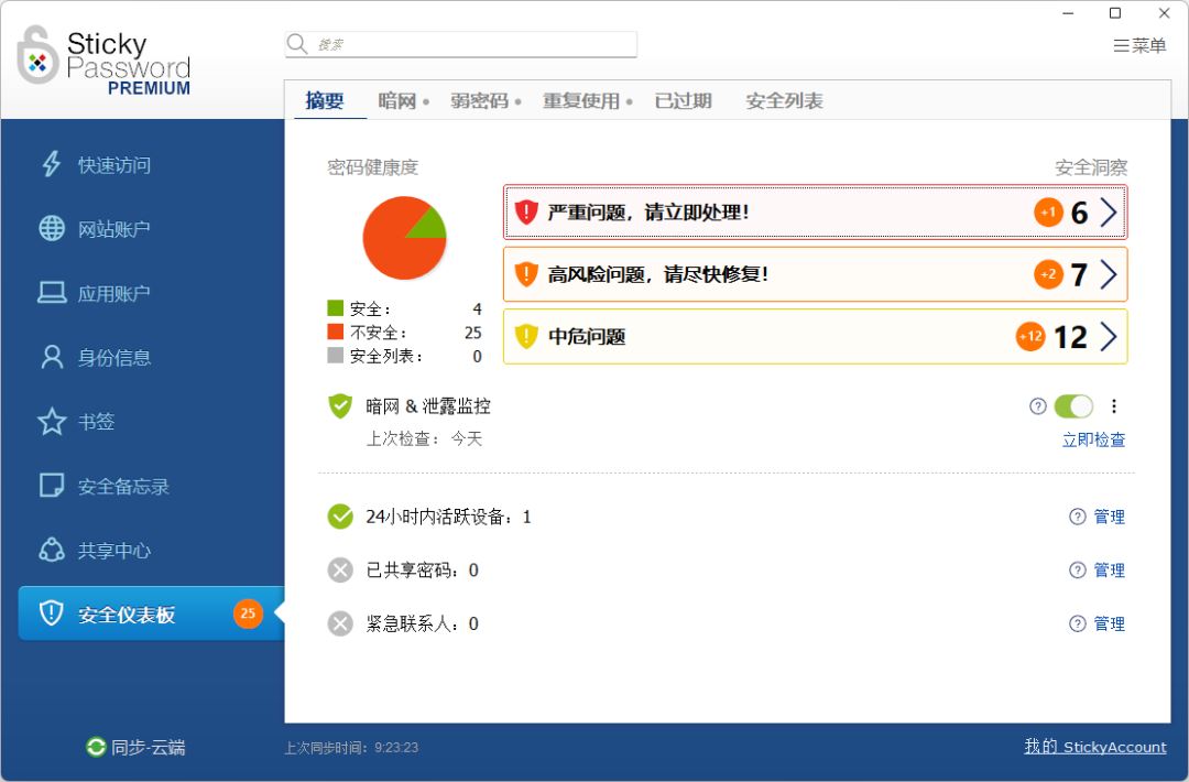 (四)暗网监控 Sticky Password 的暗网监控功能可以保护你免受数据泄露的后果。如果发现你的密码出现在暗网上,它会及时通知你,让你能够采取措施保护自己的账户。这一功能对于个人用户来说尤为重要,因为它能够提前预警潜在的安全威胁。