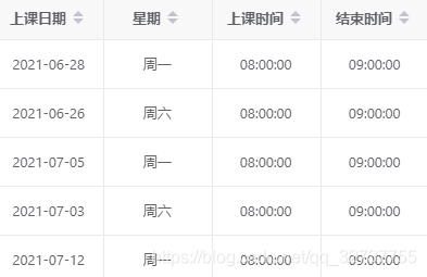 (例子,只用来展示数据结构)假如总共5节课时,从6-25日开始排课,每周一、周六上课: