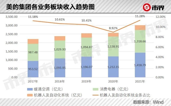 数据显示,2018年以来美的集团收入增幅有所放缓,主要是由于2017年收购的库卡机器人业务始终处于负增长,且暖通空调和消费电器业务在房地产下行的背景下出现增长乏力。2021年的收入回升,很大程度上是上游原材料涨价、美的上调产品价格导致。