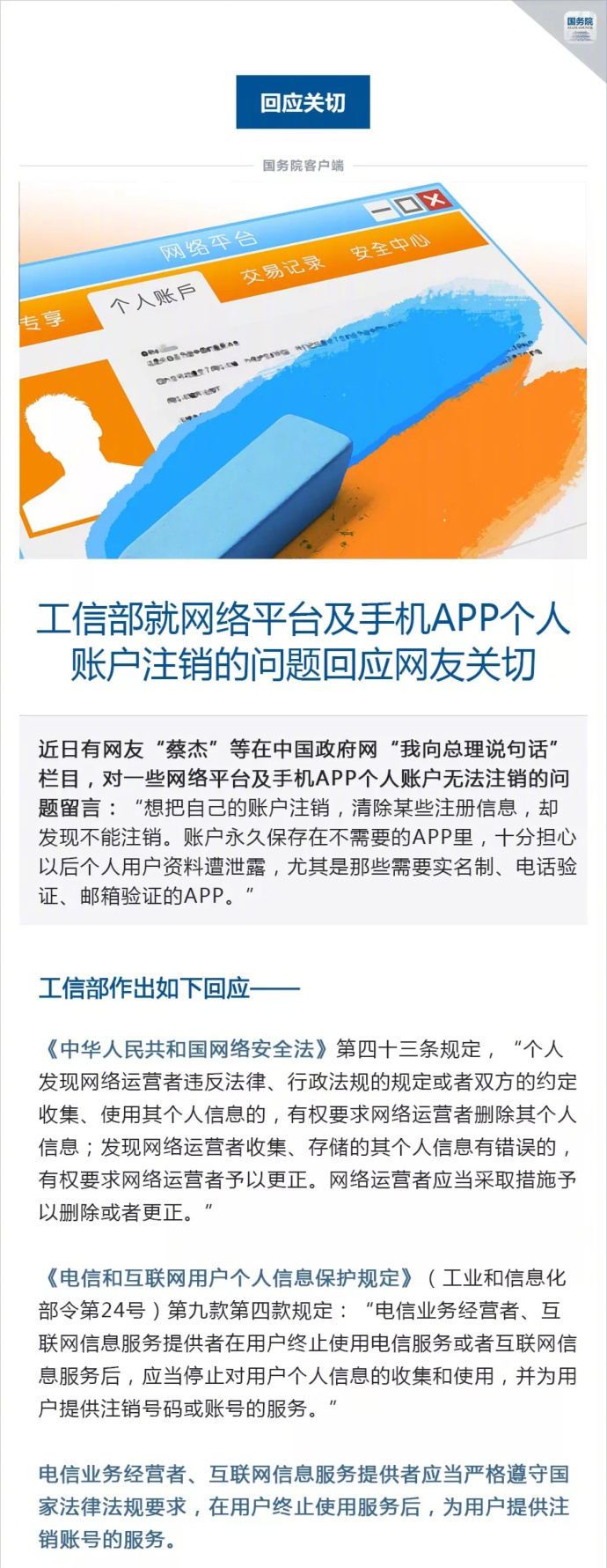 前段时间有网友在中国政府网反馈某APP应用商家通过短信等多种方式大力宣传自家的商业活动,该用户想要注销账户却发现没有注销入口。对此工信部给出官方回应:“在用户终止使用服务后,为用户提供注销账号的服务。”
