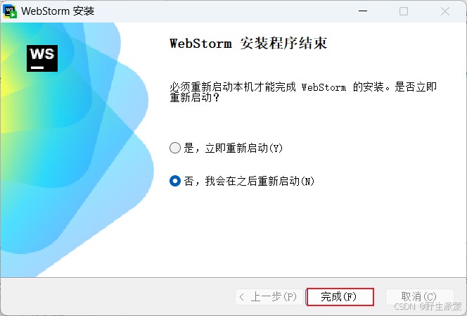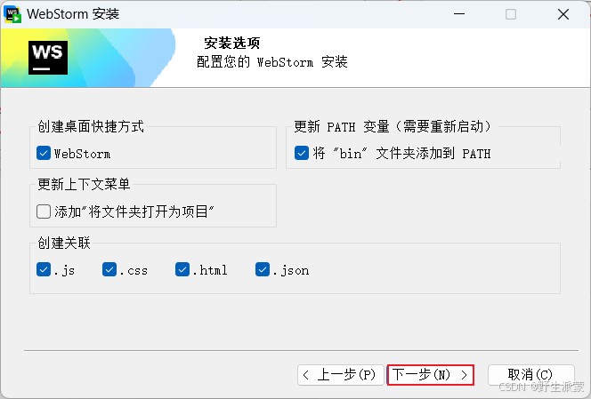 (2)更新 PATH 变量(需要重新启动):勾选后,方便在命令行中启动 WebStorm,便于与其他命令行工具或脚本协同工作。