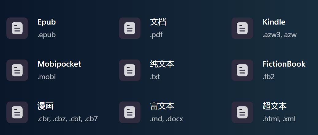 支持阅读 epub, pdf, mobi, azw3, txt, md, djvu, docx, rtf, cbz, cbr, cbt, fb2, html 和 xml 格式的图书