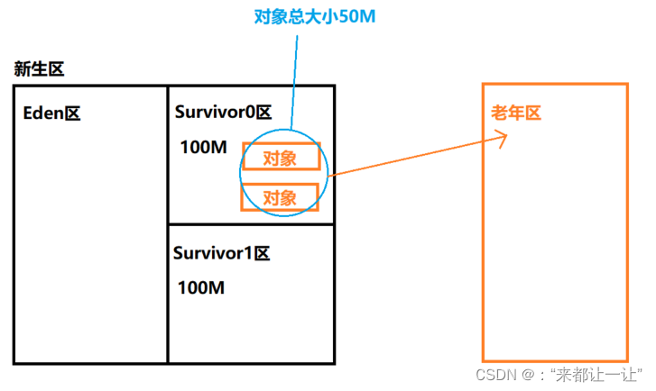 二、什么时候进入老年区呢?1 经历15次GC后进入老年区默认情况下,如果新生区中的某个对象经历了15次GC后,还是没有被回收掉,那么它就会被转入老年区。 2 动态对象年龄判断这种方法不用等到经历GC15次。 例:假设Survivor0区中的两个对象都经历的3次GC(年龄3),而且这两个对象总大小50M,超过了Survivor0区内存大小的一半。那么此时Survivor0区中年龄大于等于3岁的对象就都要被全部转移到老年区。