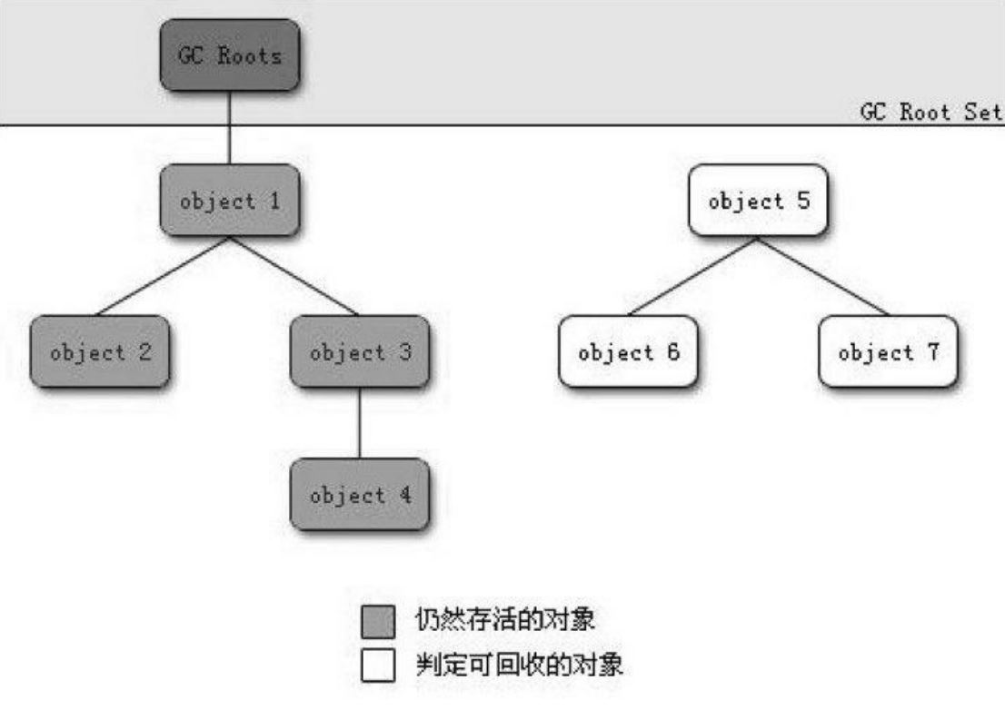 实际上这两个对象已经不可能再被访问,但是它们因为互相引用着对方,导致它们的引用计数都不为0,于是这两个对象都无法被GC回收。 1.2 可达性分析算法(Reachable Analysis)在Java中是通过可达性分析算法来判断对象是否存活的。选定一系列称为"GC ROOTS"的对象作为起始点,从这些对象向下搜索,搜索所走过的道路称为引用链(Reference Chain).当一个对象到GC ROOTS没有任何引用链时,则不可达,这些对象会被判定可以回收。 如图: