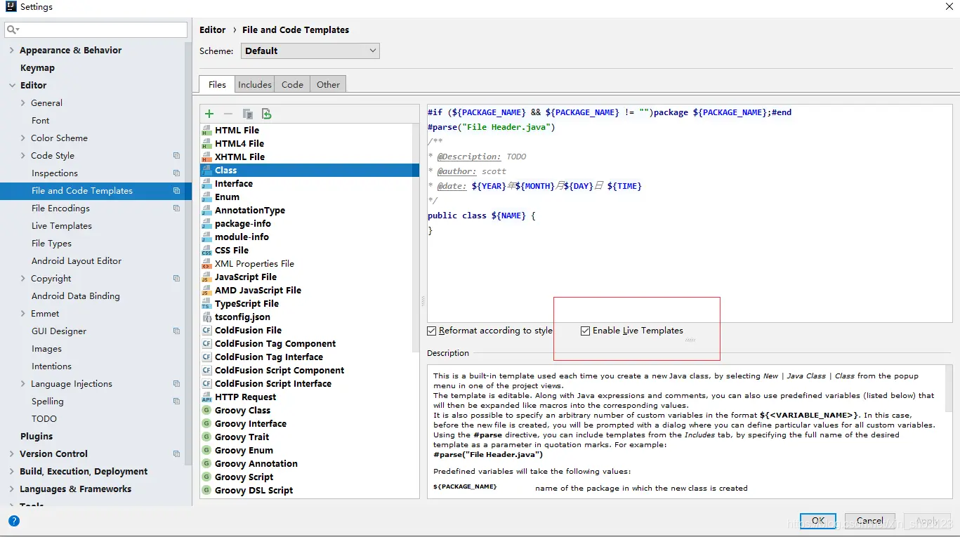 2.通过快捷键,添加类注释和方法注释的模板设置2.1类注释 【快捷键:cls + TAB】 File->Settings->Editor->Live Templates->Class